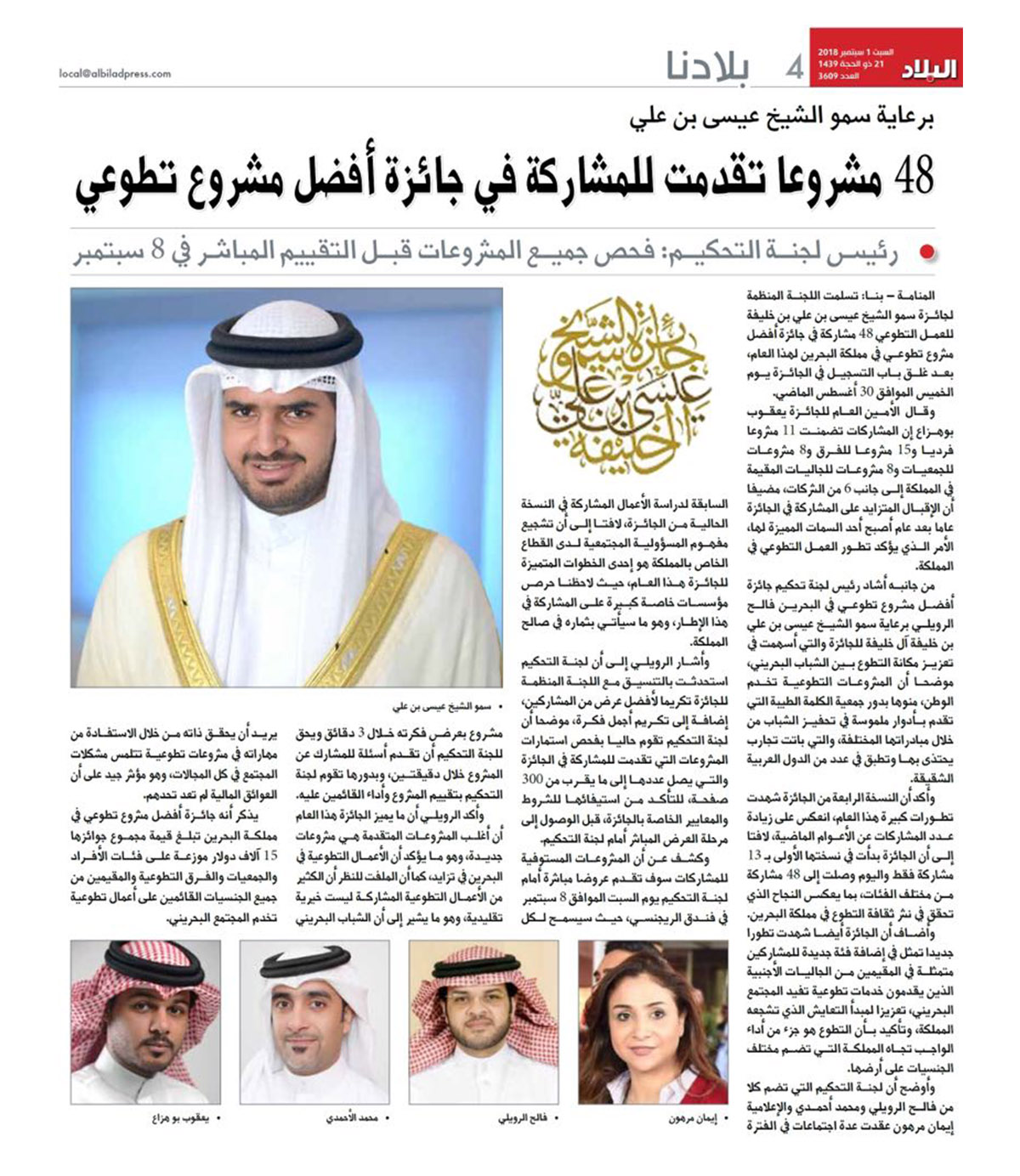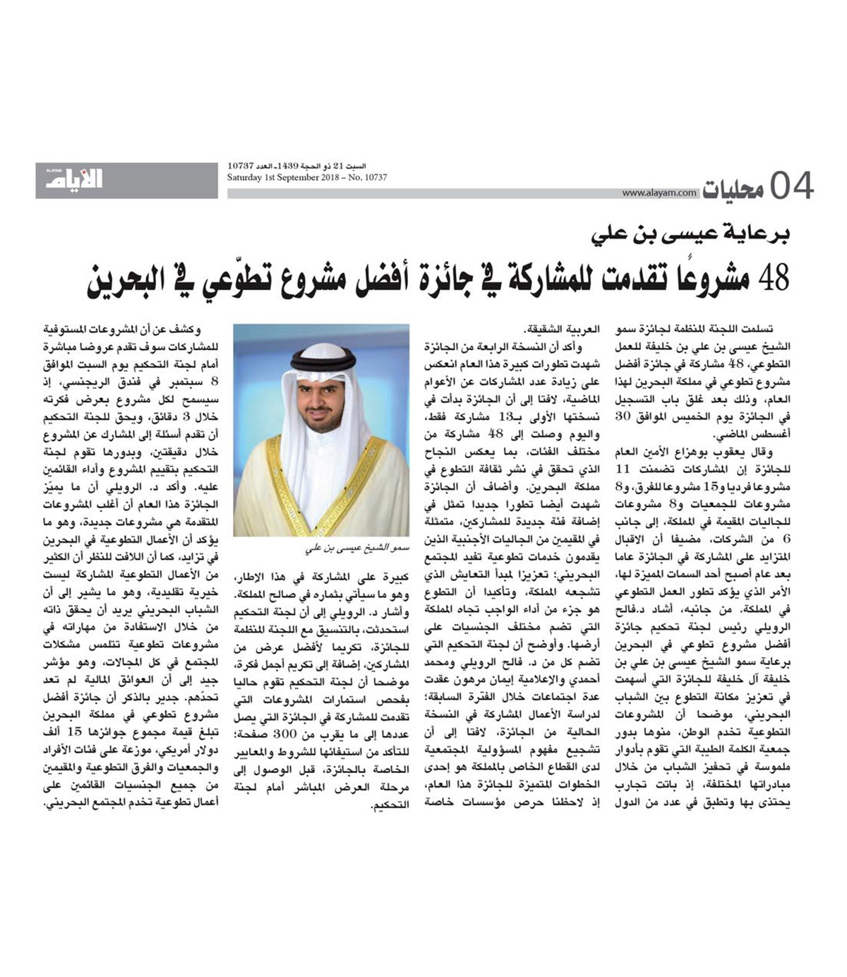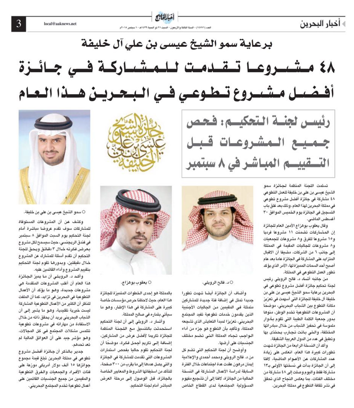 شاهد تغطية الصحف 1 سبتمبر 2018م | برعاية من سمو الشيخ عيسى بن علي .. 48 مشروعاً تقدمت للمشاركة في جائزة أفضل مشروع تطوعي في البحرين