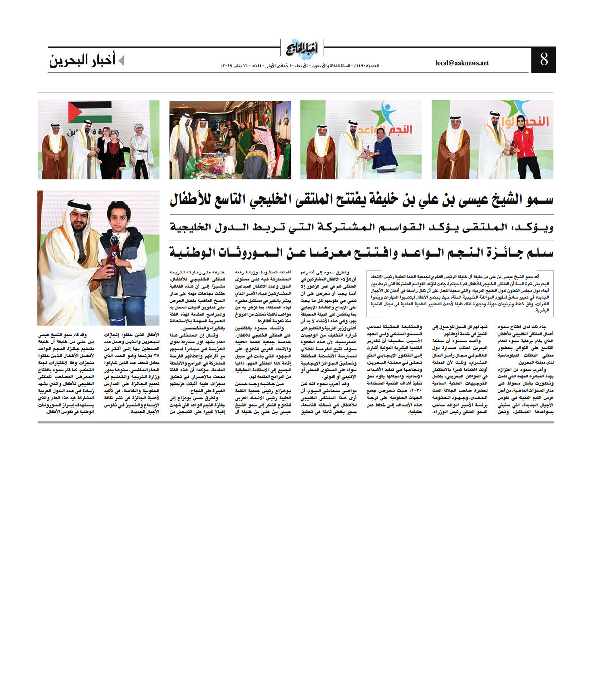 تغطية صحفية : سمو الشيخ عيسى بن علي بن خليفة يفتتح الملتقى الخليجي التاسع للأطفال.
