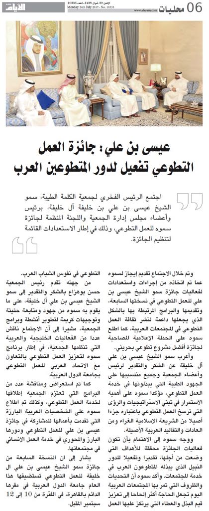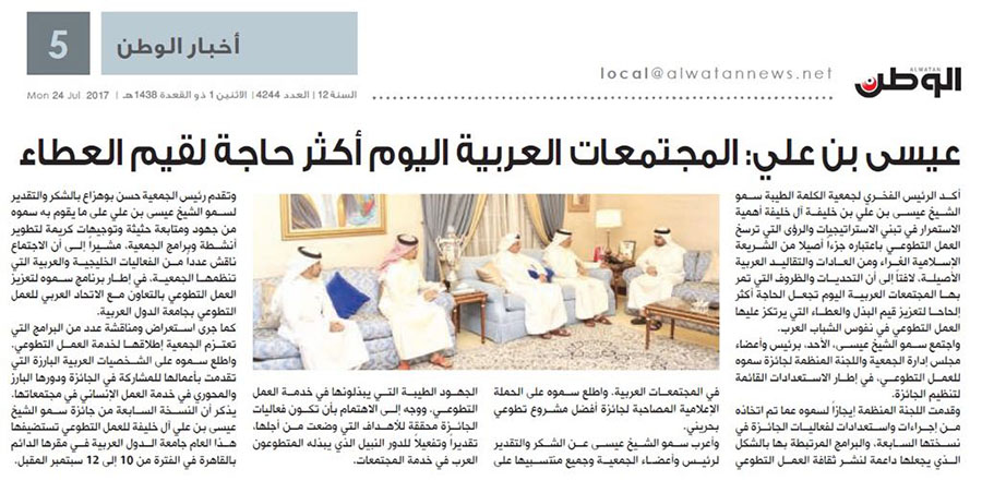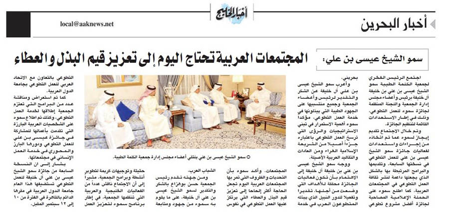 سمو الشيخ عيسى بن علي : المجتمعات العربية تحتاج اليوم تعزيز قيم البذل والعطاء - تغطية الصحف المحلية