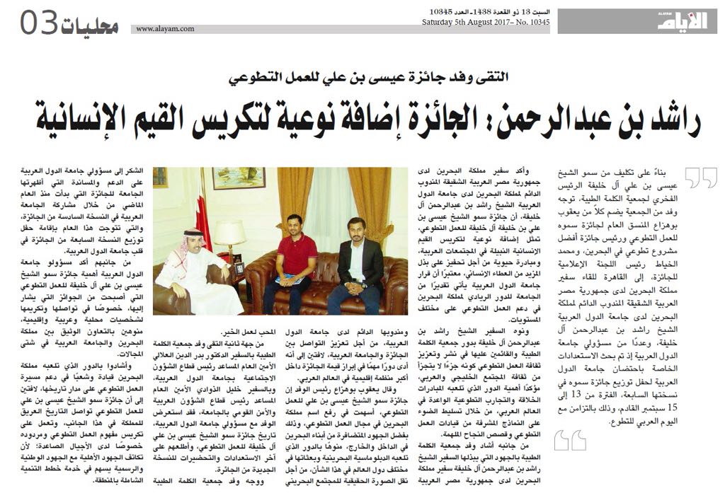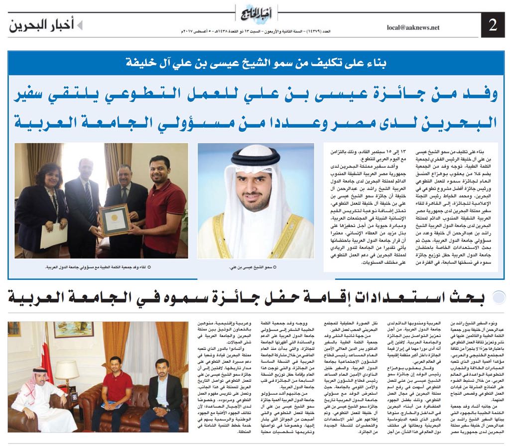 وفد من جائزة سمو الشيخ عيسى بن علي للعمل التطوعي يلتقي سفير البحرين لدى مصر وعددا من مسؤولي الجامعة العربية - تغطية الصحف المحلية