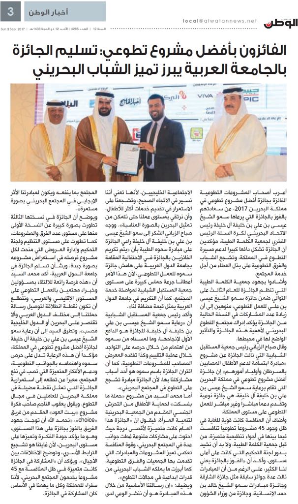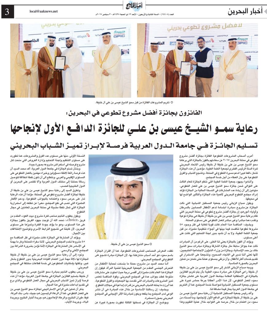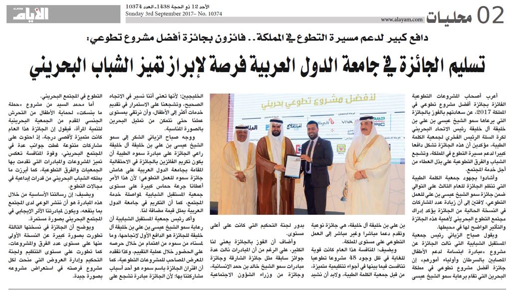 الفائزون بجائزة أفضل مشروع تطوعي في البحرين: تسليم الجائزة في جامعة الدول العربية فرصة لإبراز تميز الشباب البحريني