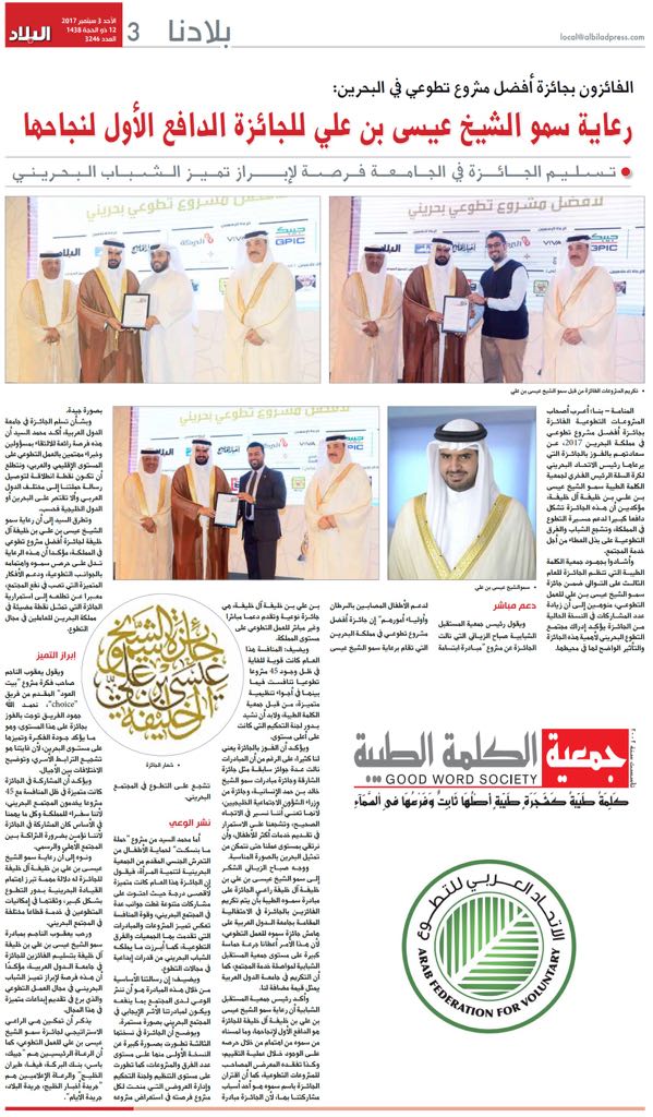 أعرب أصحاب المشروعات التطوعية الفائزة بجائزة أفضل مشروع تطوعي في مملكة البحرين 2017 عن سعادتهم بالفوز بالجائزة التي يرعاها سمو الشيخ عيسى بن علي بن خليفة آل خليفة رئيس الاتحاد البحريني لكرة السلة الرئيس الفخري لجمعية الكلمة الطيبة،