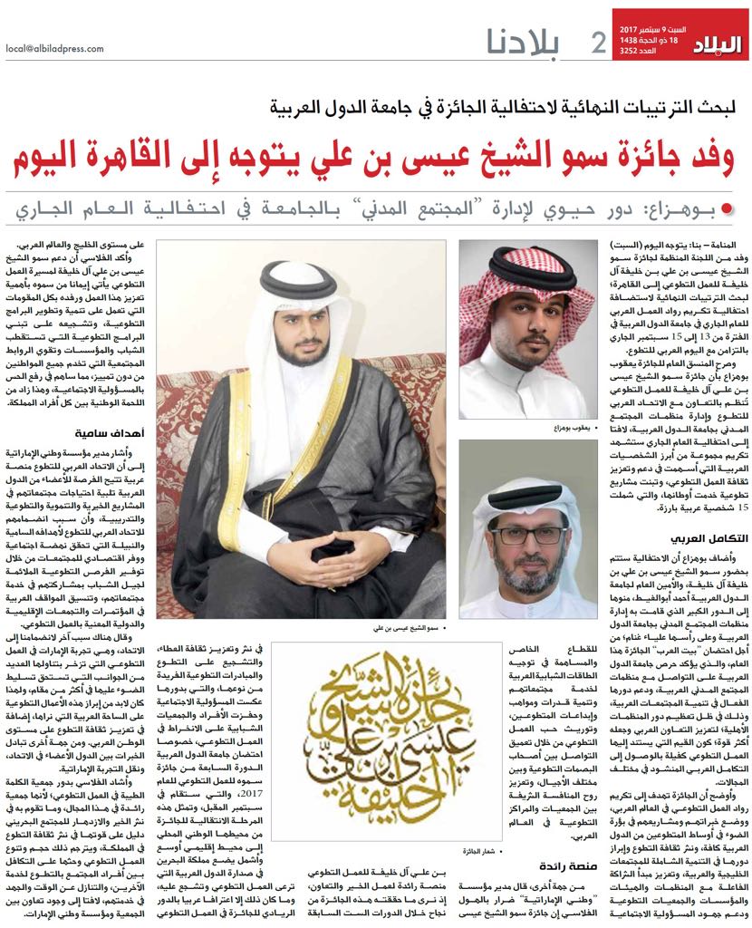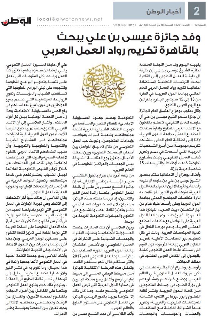 من جهته قال السيد ضرار بالهول الفلاسي مدير مؤسسة "وطني الإماراتية" إن جائزة سمو الشيخ عيسى بن علي آل خليفة للعمل التطوعي منصة رائدة لعمل الخير والتعاون، إذ نرى ما حققته هذه الجائزة من نجاح خلال الست دورات السابقة في نشر وتعزيز ثقافة العطاء والتشجيع على التطوع والمبادرات التطوعية الفريدة من نوعها، والتي بدورها عكست المسؤولية الاجتماعية وحفزت الأفراد والجمعيات الشبابية على الانخراط في العمل التطوعي، وبالأخص احتضان جامعة الدول العربية الدورة السابعة من جائزة سموه للعمل التطوعي لعام 2017 والتي ستقام خلال شهر سبتمبر القادم، وتمثل هذه المرحلة الانتقالية للجائزة من محيطها الوطني المحلي إلى محيط إقليمي أوسع وأشمل يضع مملكة البحرين في صدارة الدول العربية التي ترعى العمل التطوعي وتشجع عليه، وما كان ذلك إلا اعترافا عربيا بالدور الريادي للجائزة في العمل التطوعي على مستوى الخليج والعالم العربي.