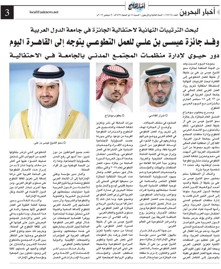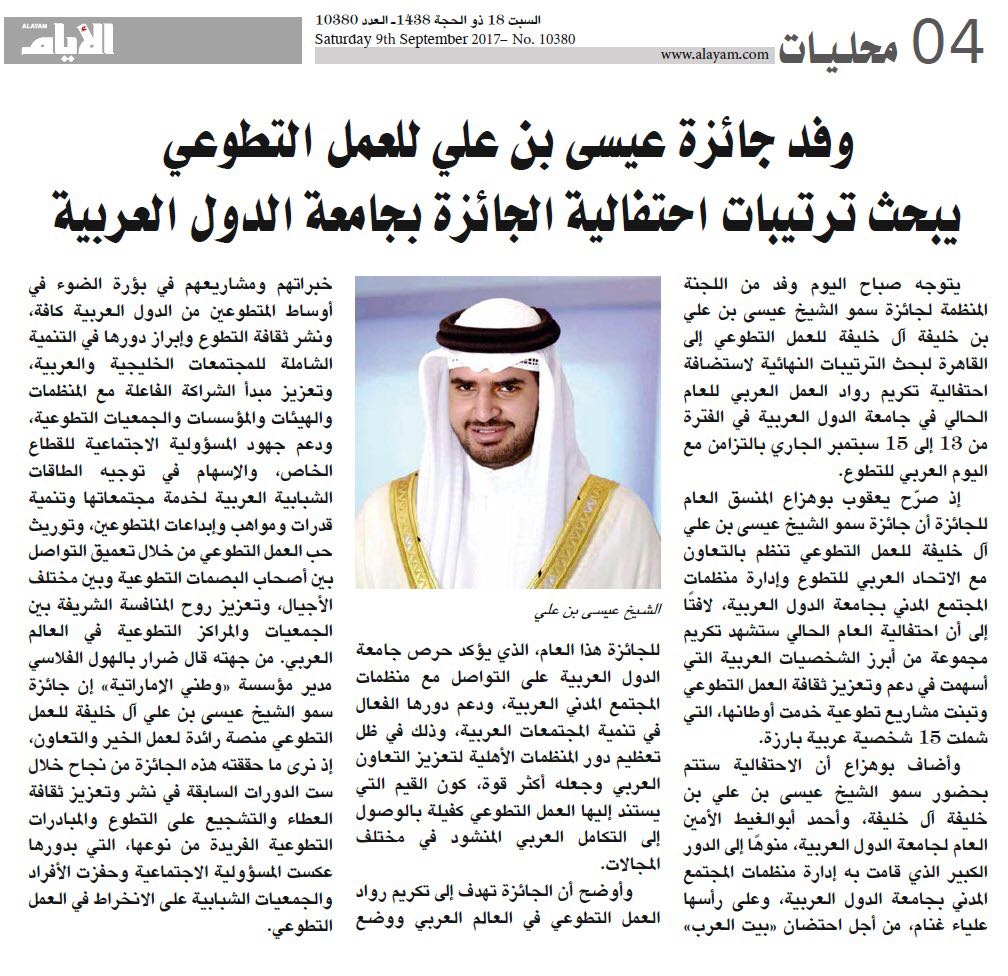 المنامة في في 08 سبتمبر/ بنا / يتوجه يوم غد السبت وفد من اللجنة المنظمة لجائزة سمو الشيخ عيسى بن علي بن خليفة آل خليفة للعمل التطوعي إلى القاهرة لبحث الترتيبات النهائية لاستضافة احتفالية تكريم رواد العمل العربي للعام الحالي في جامعة الدول العربية في الفترة من 13 إلى 15 سبتمبر الجاري بالتزامن مع اليوم العربي للتطوع.
