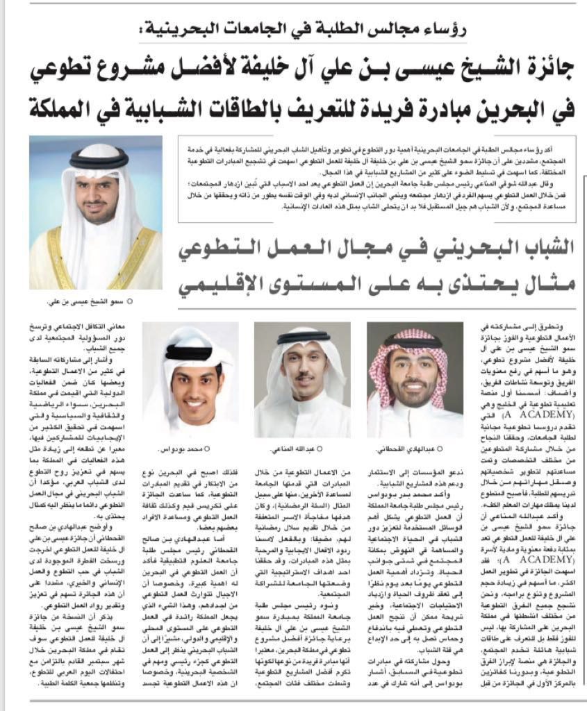 ونوه رئيس مجلس طلبة جامعة المملكة بمبادرة سمو الشيخ عيسى بن علي آل خليفة برعاية جائزة أفضل مشروع تطوعي في مملكة البحرين معتبرا أنها "مبادرة فريدة من نوعها كونها تكرم أفضل المشاريع التطوعية وشملت مختلف فئات المجتمع فلذلك اصبح في البحرين نوع من الابتكار في تقديم المبادرات التطوعية و كما ساعدت الجائزة على تكريس قيم و كذلك ثقافة العمل التطوعي و مساعدة الافراد لبعضهم البعض".